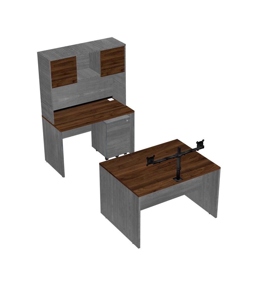 Office Parallel Desk Credenza Desk + Wooden Mobile Drawers + Hutch + Monitor Arm (double Arms)