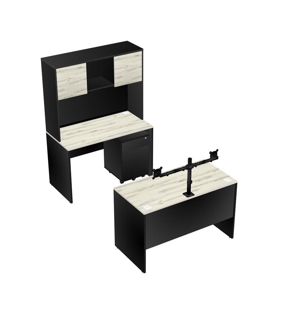 Office Parallel Desk Credenza Desk + Wooden Mobile Drawers + Hutch + Monitor Arm (double Arms)