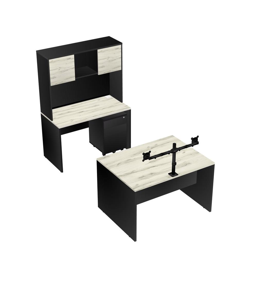Office Parallel Desk Credenza Desk + Wooden Mobile Drawers + Hutch + Monitor Arm (double Arms)