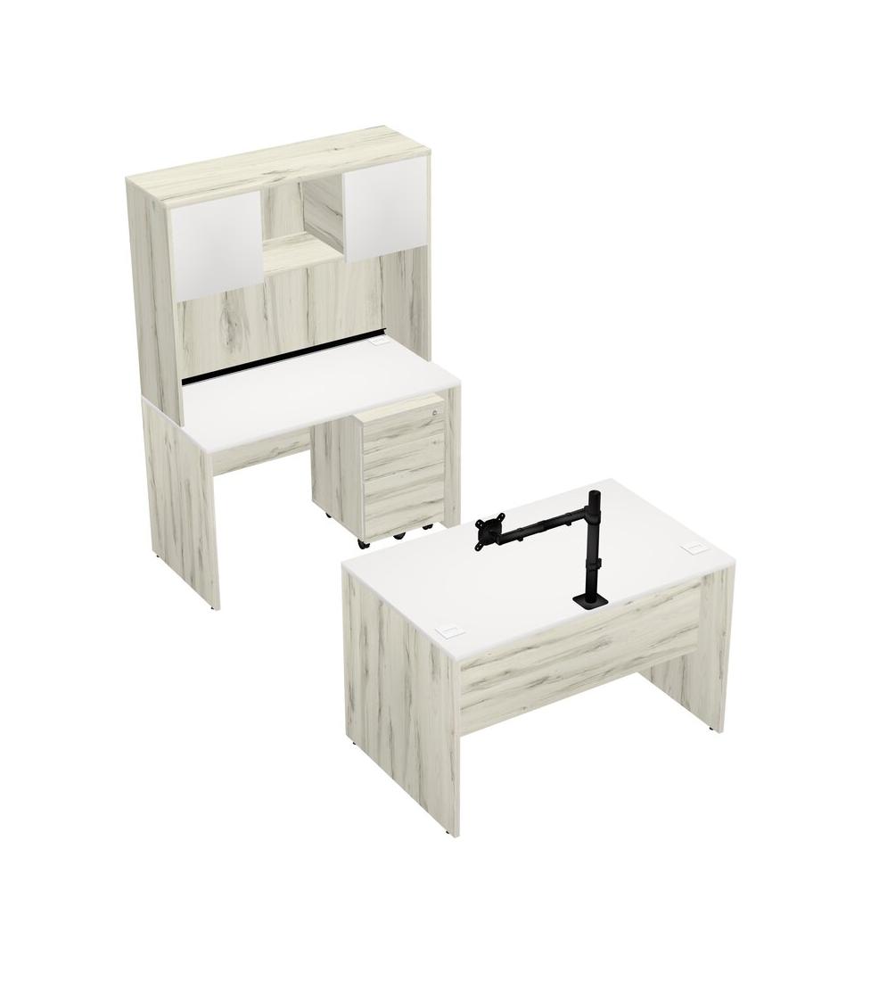 Office Parallel Desk Credenza Desk + Wooden Mobile Drawers + Hutch + Monitor Arm (single Arm)