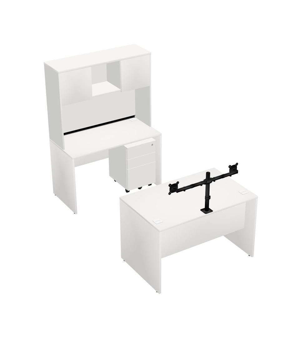 Office Parallel Desk Credenza Desk + Wooden Mobile Drawers + Hutch + Monitor Arm (double Arms)