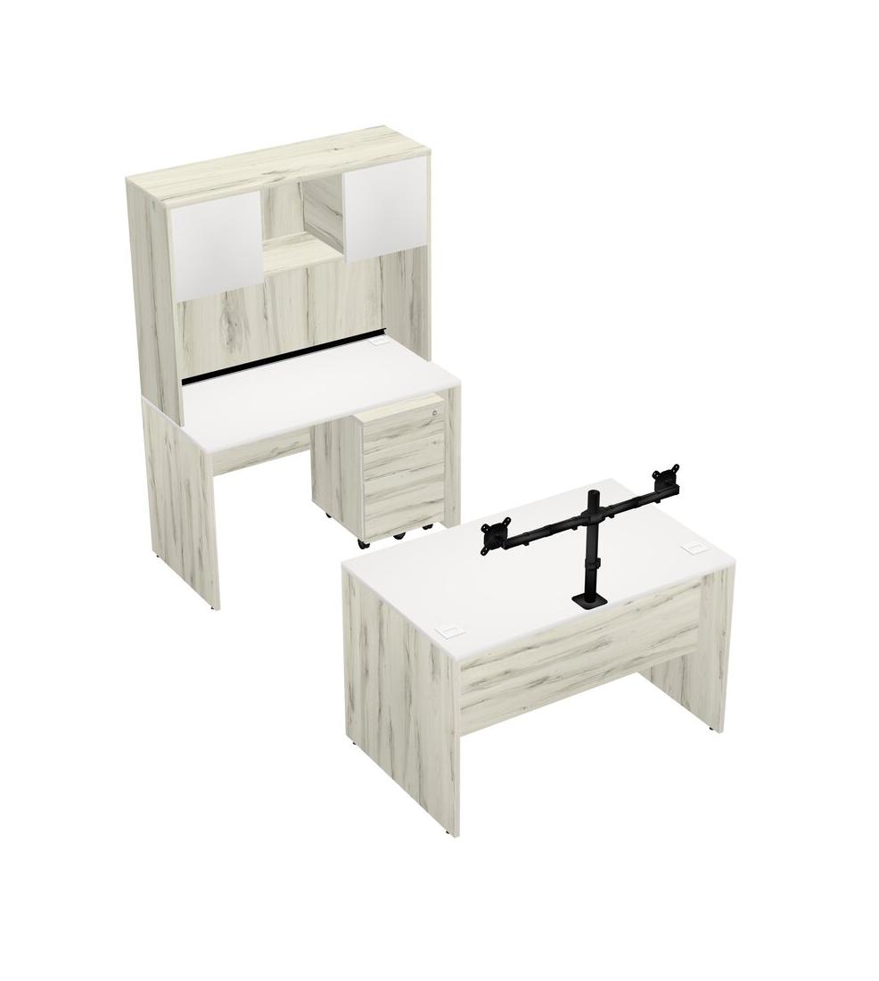 Office Parallel Desk Credenza Desk + Wooden Mobile Drawers + Hutch + Monitor Arm (double Arms)