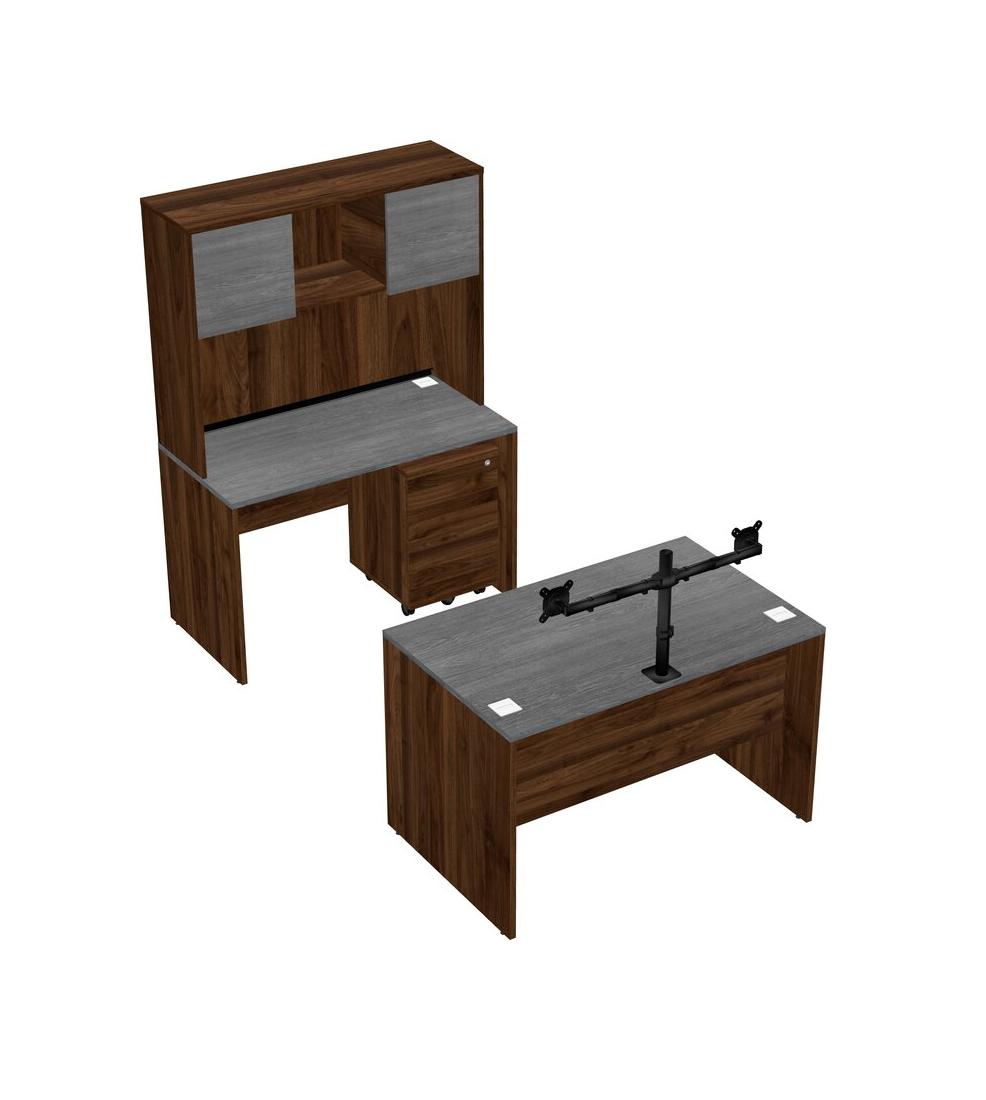 Office Parallel Desk Credenza Desk + Wooden Mobile Drawers + Hutch + Monitor Arm (double Arms)