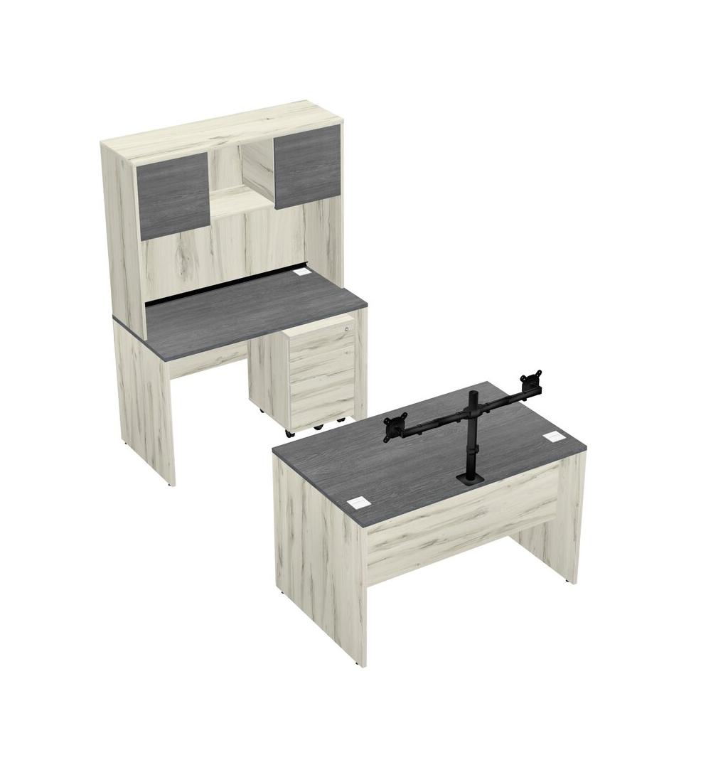 Office Parallel Desk Credenza Desk + Wooden Mobile Drawers + Hutch + Monitor Arm (double Arms)