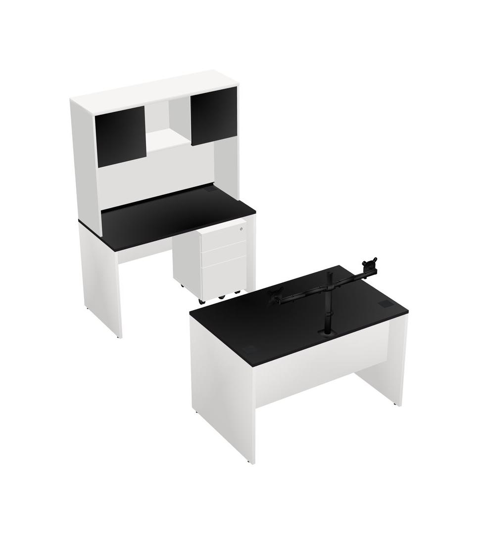Office Parallel Desk Credenza Desk + Wooden Mobile Drawers + Hutch + Monitor Arm (double Arms)