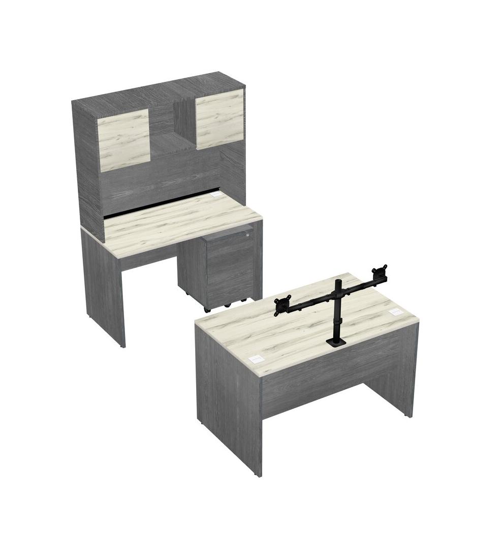 Office Parallel Desk Credenza Desk + Wooden Mobile Drawers + Hutch + Monitor Arm (double Arms)