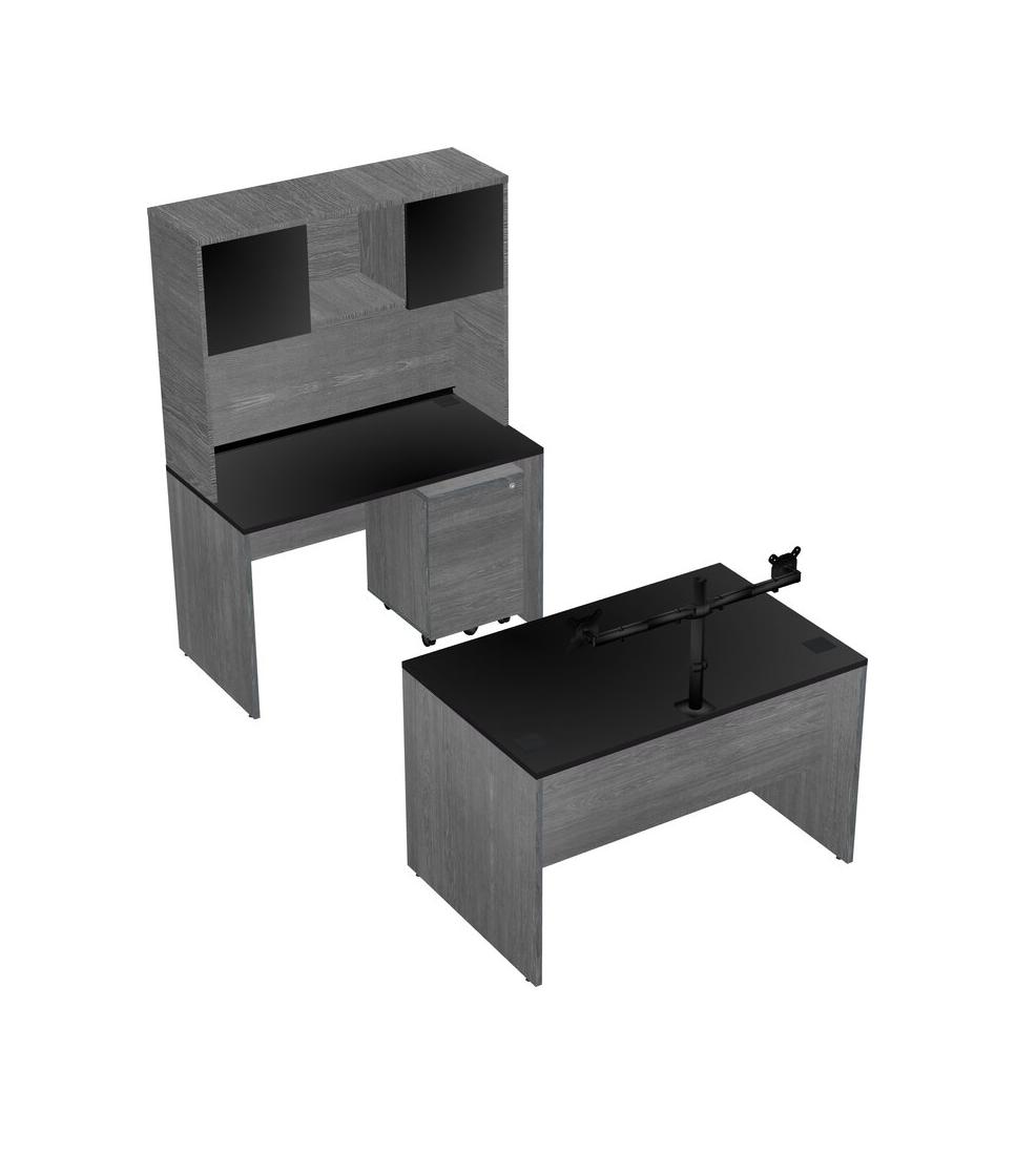 Office Parallel Desk Credenza Desk + Wooden Mobile Drawers + Hutch + Monitor Arm (double Arms)