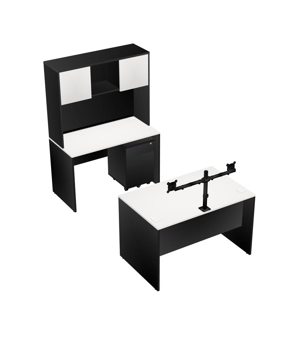 Office Parallel Desk Credenza Desk + Wooden Mobile Drawers + Hutch + Monitor Arm (double Arms)