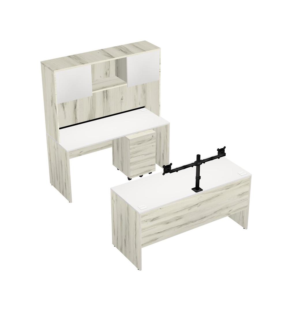 Office Parallel Desk Credenza Desk + Wooden Mobile Drawers + Hutch + Monitor Arm (double Arms)