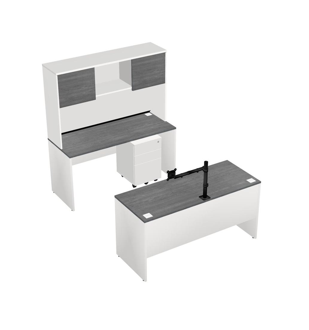 Office Parallel Desk Credenza Desk + Wooden Mobile Drawers + Hutch + Monitor Arm (single Arm)