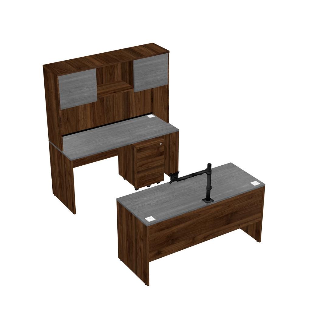 Office Parallel Desk Credenza Desk + Wooden Mobile Drawers + Hutch + Monitor Arm (single Arm)