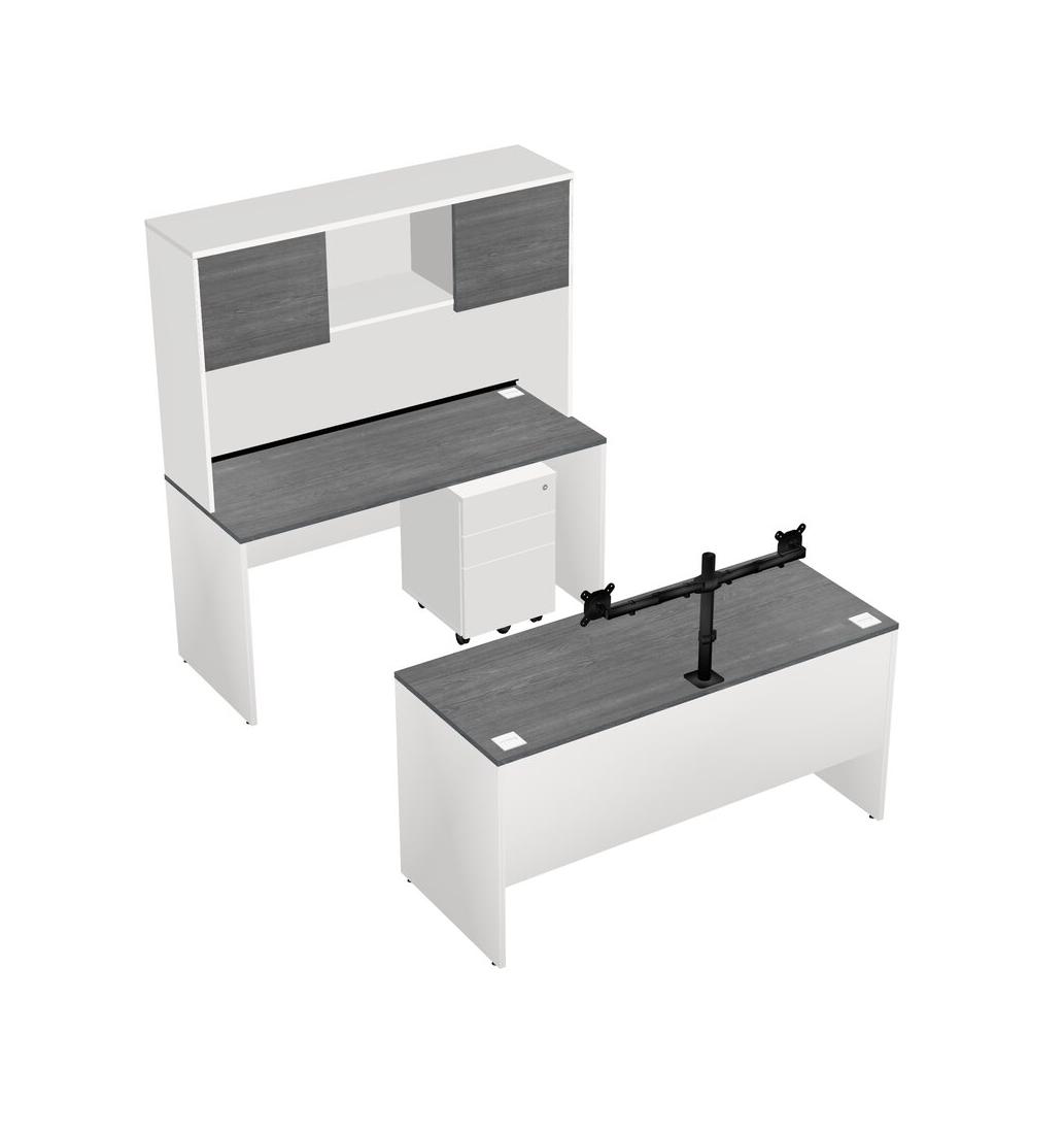Office Parallel Desk Credenza Desk + Wooden Mobile Drawers + Hutch + Monitor Arm (double Arms)
