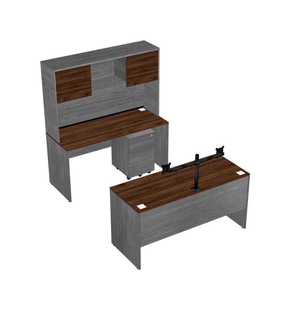 Office Parallel Desk Credenza Desk + Wooden Mobile Drawers + Hutch + Monitor Arm (double Arms)