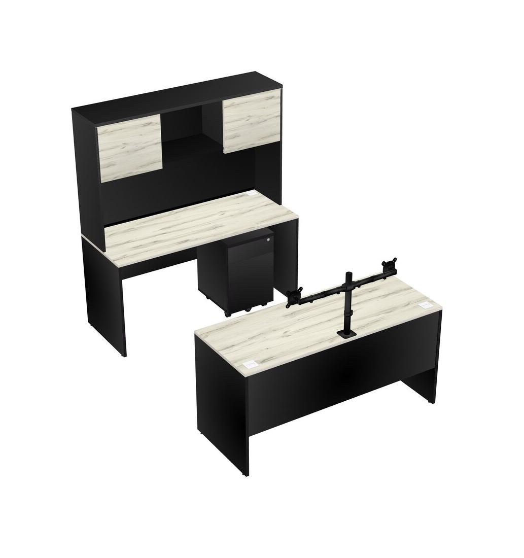 Office Parallel Desk Credenza Desk + Wooden Mobile Drawers + Hutch + Monitor Arm (double Arms)
