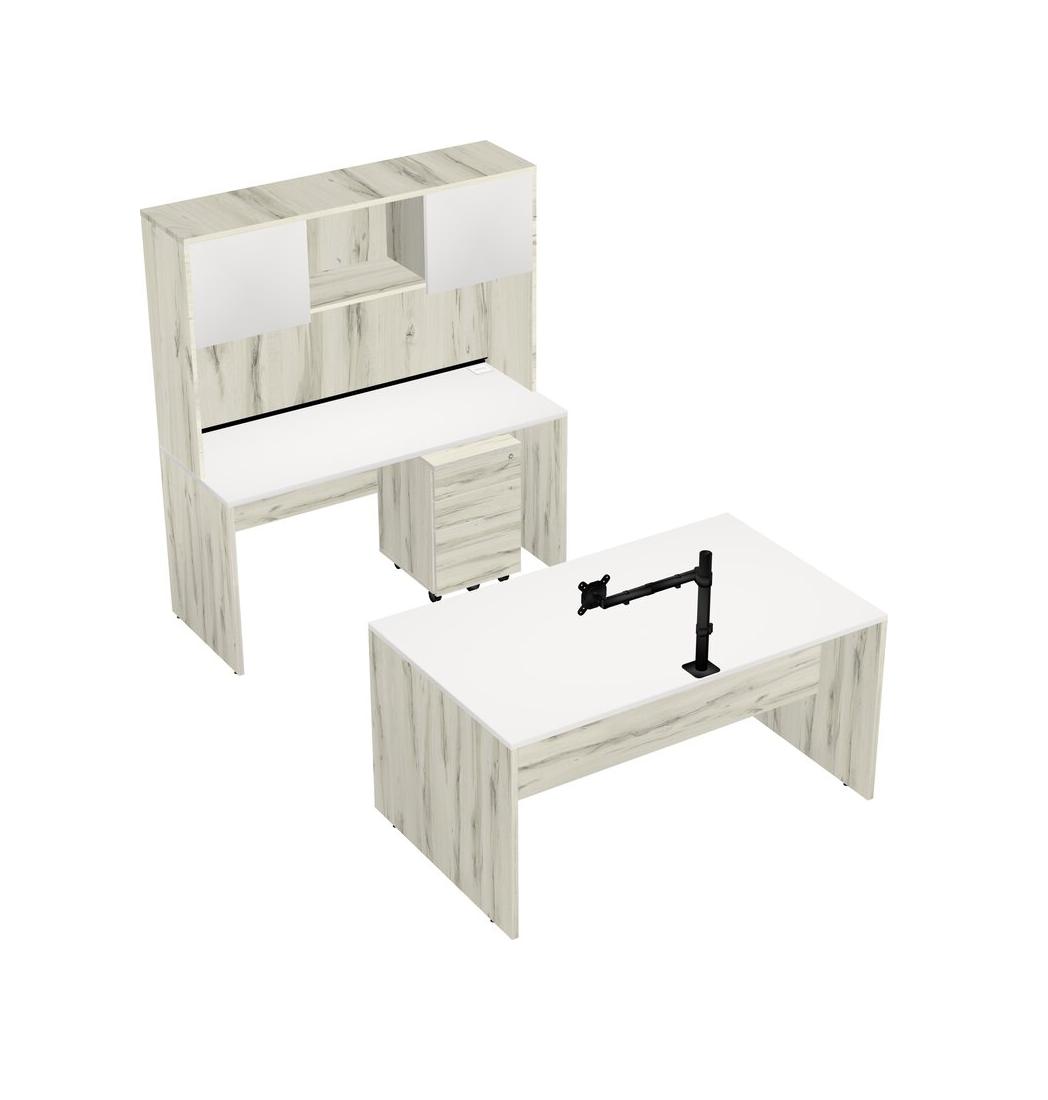 Office Parallel Desk Credenza Desk + Wooden Mobile Drawers + Hutch + Monitor Arm (single Arm)