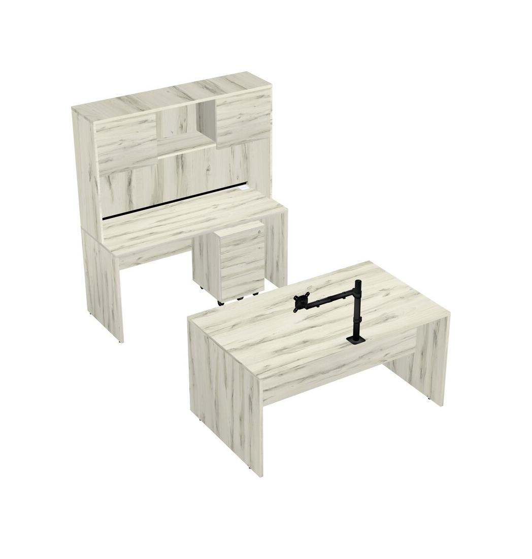 Office Parallel Desk Credenza Desk + Wooden Mobile Drawers + Hutch + Monitor Arm (single Arm)