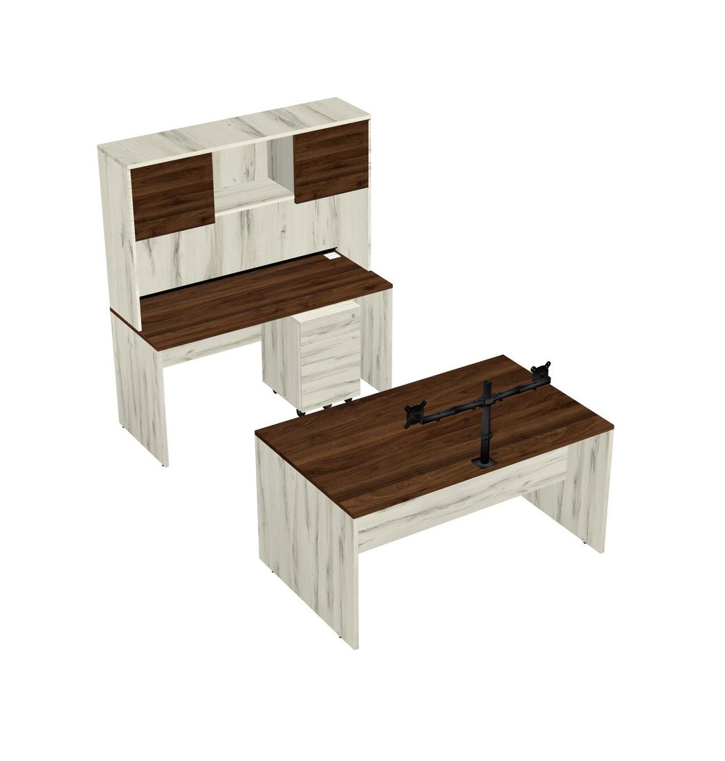 Office Parallel Desk Credenza Desk + Wooden Mobile Drawers + Hutch + Monitor Arm (double Arms)