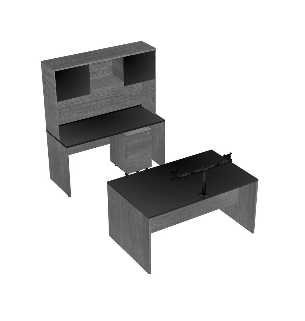 Office Parallel Desk Credenza Desk + Wooden Mobile Drawers + Hutch + Monitor Arm (double Arms)
