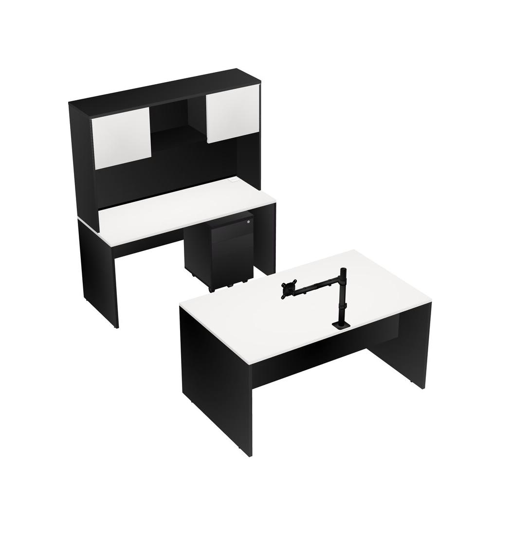 Office Parallel Desk Credenza Desk + Wooden Mobile Drawers + Hutch + Monitor Arm (single Arm)