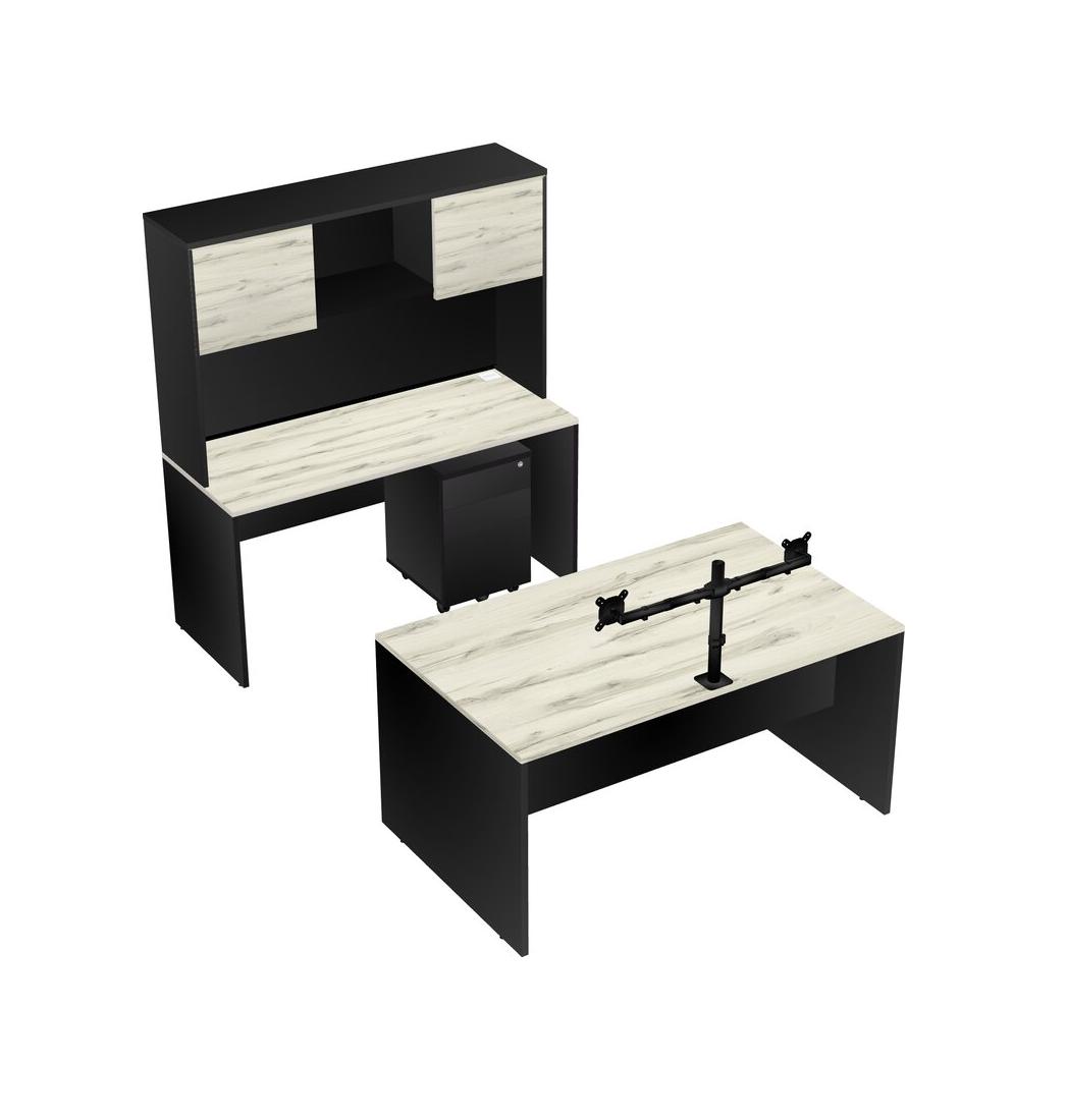 Office Parallel Desk Credenza Desk + Wooden Mobile Drawers + Hutch + Monitor Arm (double Arms)