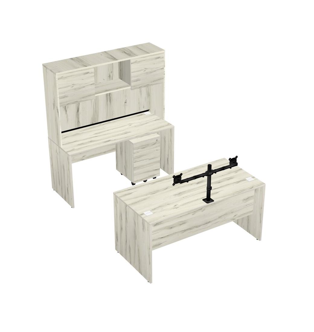Office Parallel Desk Credenza Desk + Wooden Mobile Drawers + Hutch + Monitor Arm (double Arms)