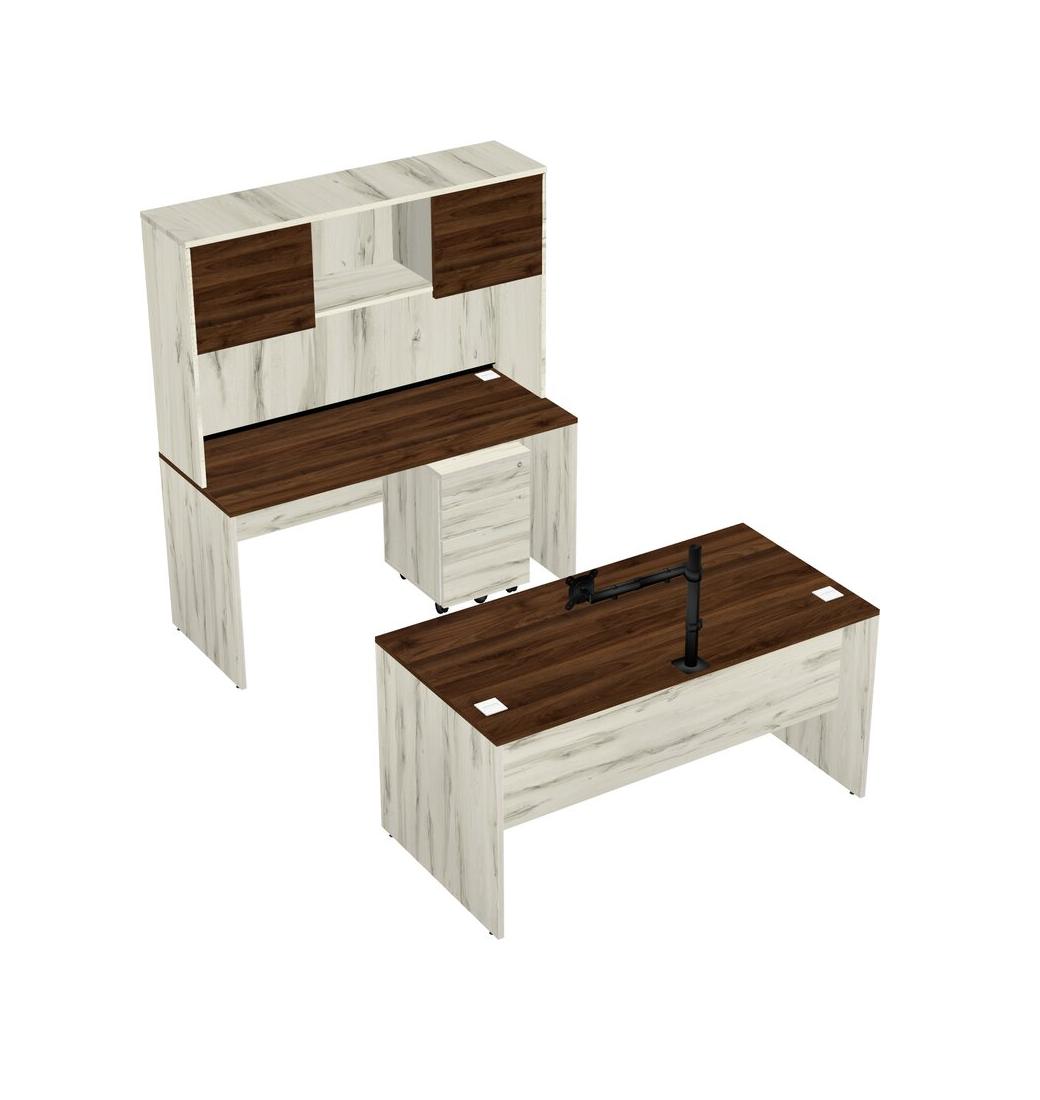 Office Parallel Desk Credenza Desk + Wooden Mobile Drawers + Hutch + Monitor Arm (single Arm)
