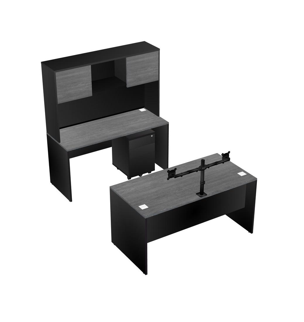 Office Parallel Desk Credenza Desk + Wooden Mobile Drawers + Hutch + Monitor Arm (double Arms)