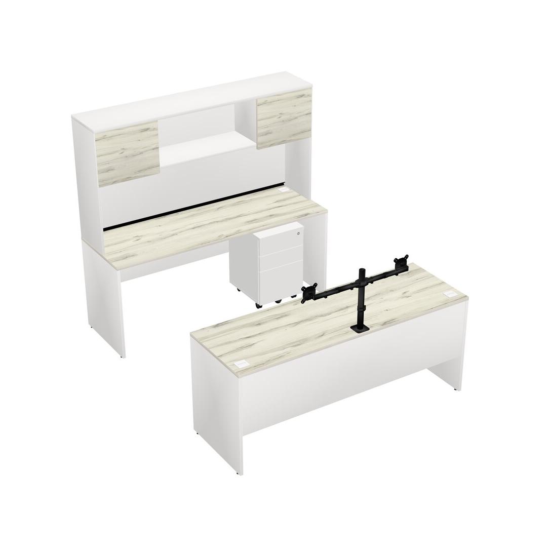 Office Parallel Desk Credenza Desk + Wooden Mobile Drawers + Hutch + Monitor Arm (double Arms)
