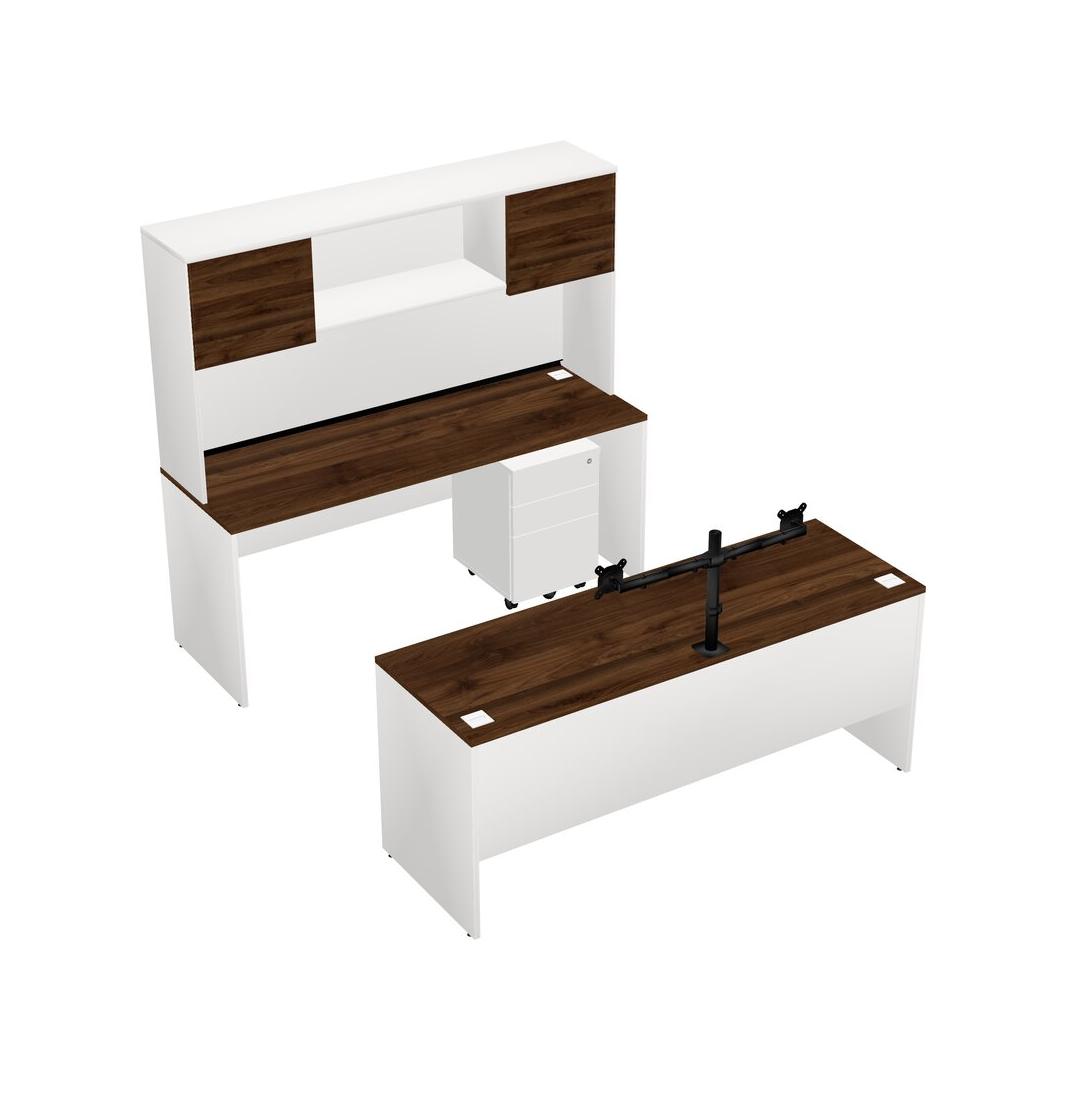 Office Parallel Desk Credenza Desk + Wooden Mobile Drawers + Hutch + Monitor Arm (double Arms)