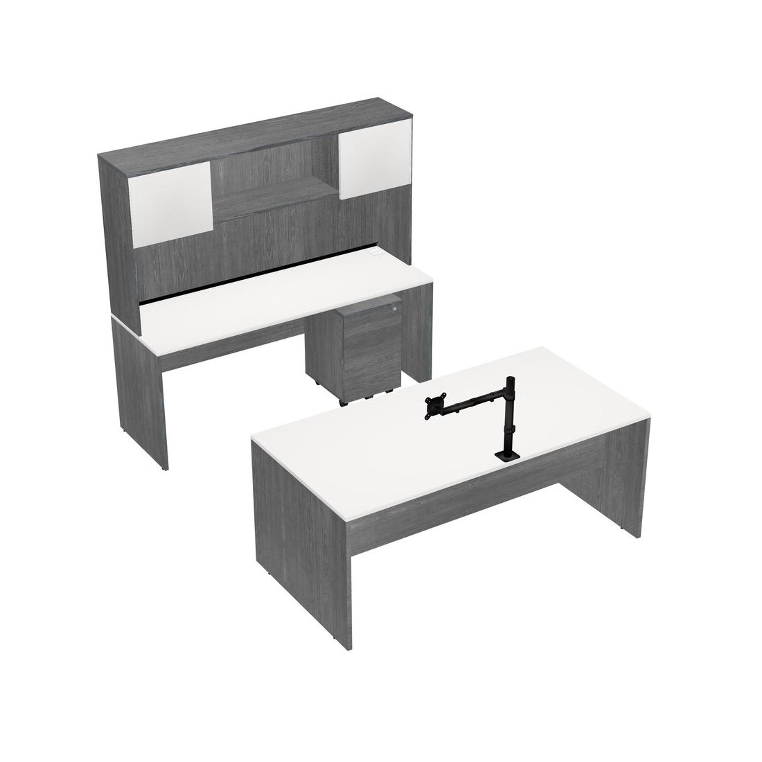 Office Parallel Desk Credenza Desk + Wooden Mobile Drawers + Hutch + Monitor Arm (single Arm)