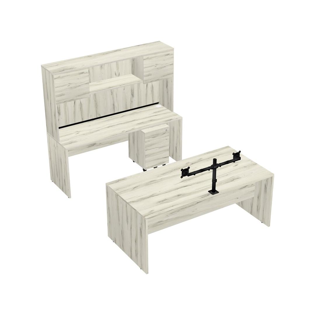 Office Parallel Desk Credenza Desk + Wooden Mobile Drawers + Hutch + Monitor Arm (double Arms)