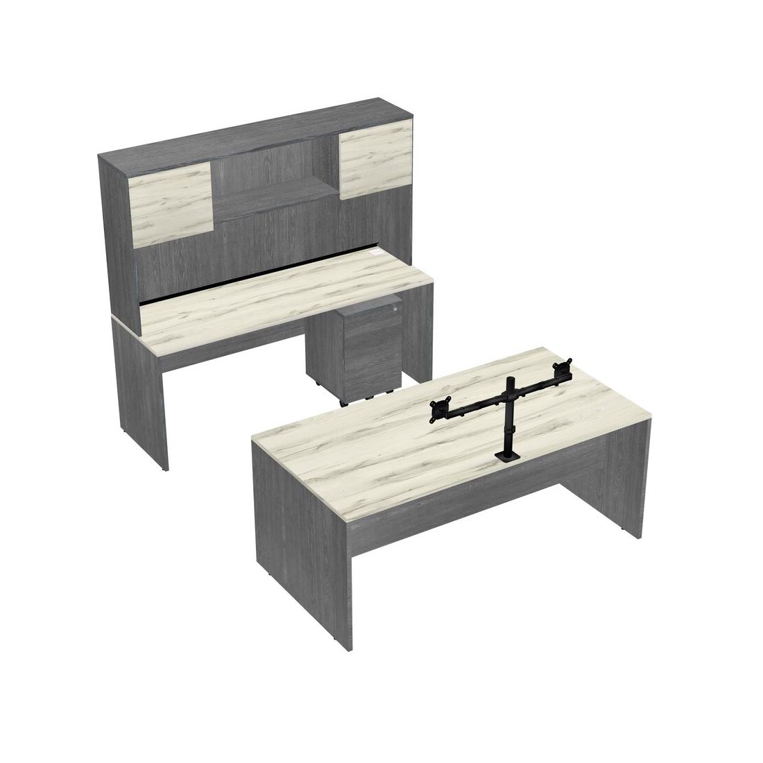 Office Parallel Desk Credenza Desk + Wooden Mobile Drawers + Hutch + Monitor Arm (double Arms)