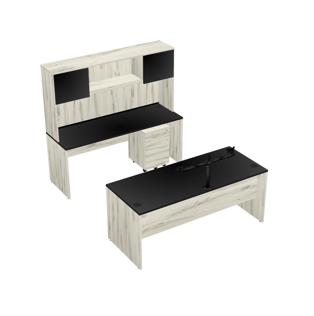 Office Parallel Desk Credenza Desk + Wooden Mobile Drawers + Hutch + Monitor Arm (double Arms)