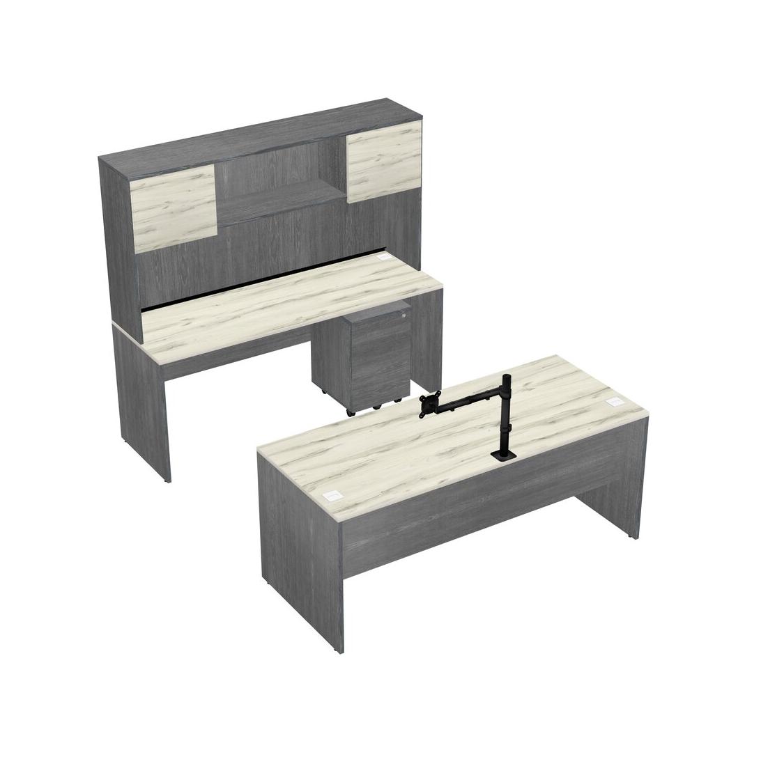 Office Parallel Desk Credenza Desk + Wooden Mobile Drawers + Hutch + Monitor Arm (single Arm)