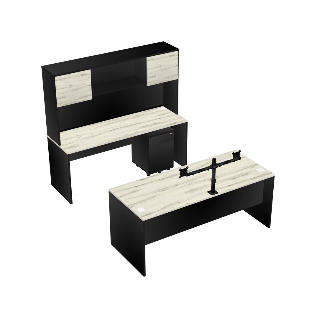 Office Parallel Desk Credenza Desk + Wooden Mobile Drawers + Hutch + Monitor Arm (double Arms)