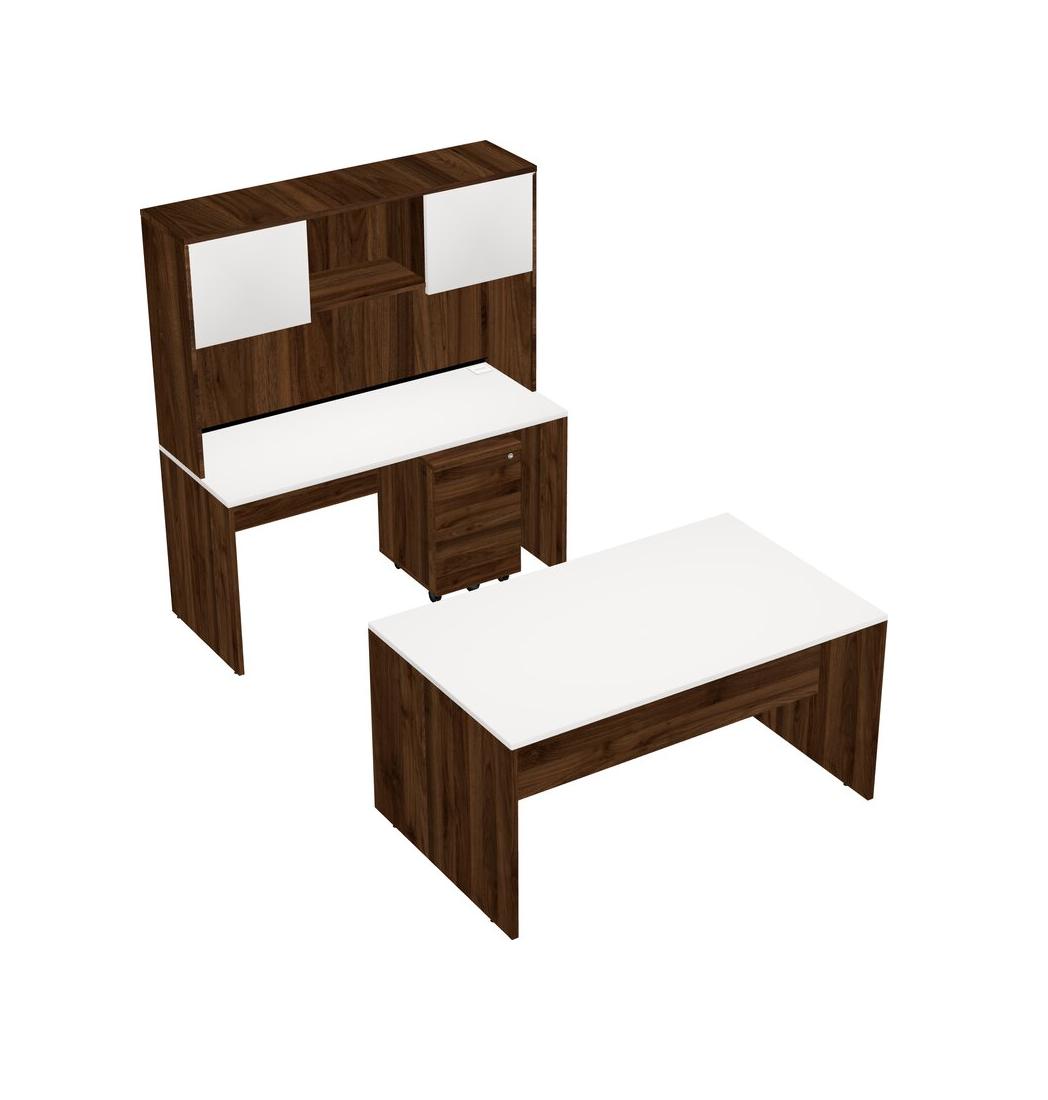 Office Parallel Desk Credenza Desk + Wooden Mobile Drawers + Hutch