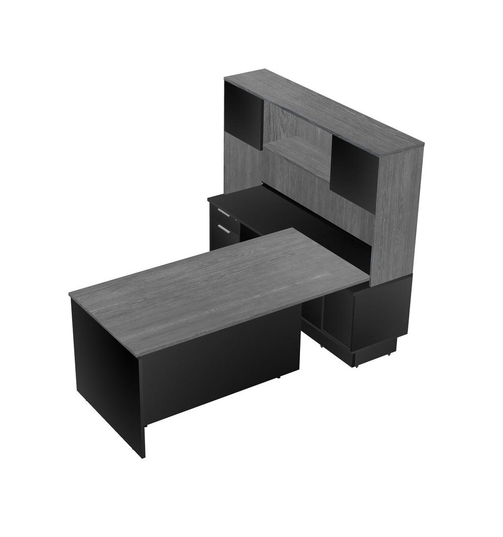 Grey Modern Executive Desk With Low Sliding Door Cabinet With Built-in Drawers + Hutch