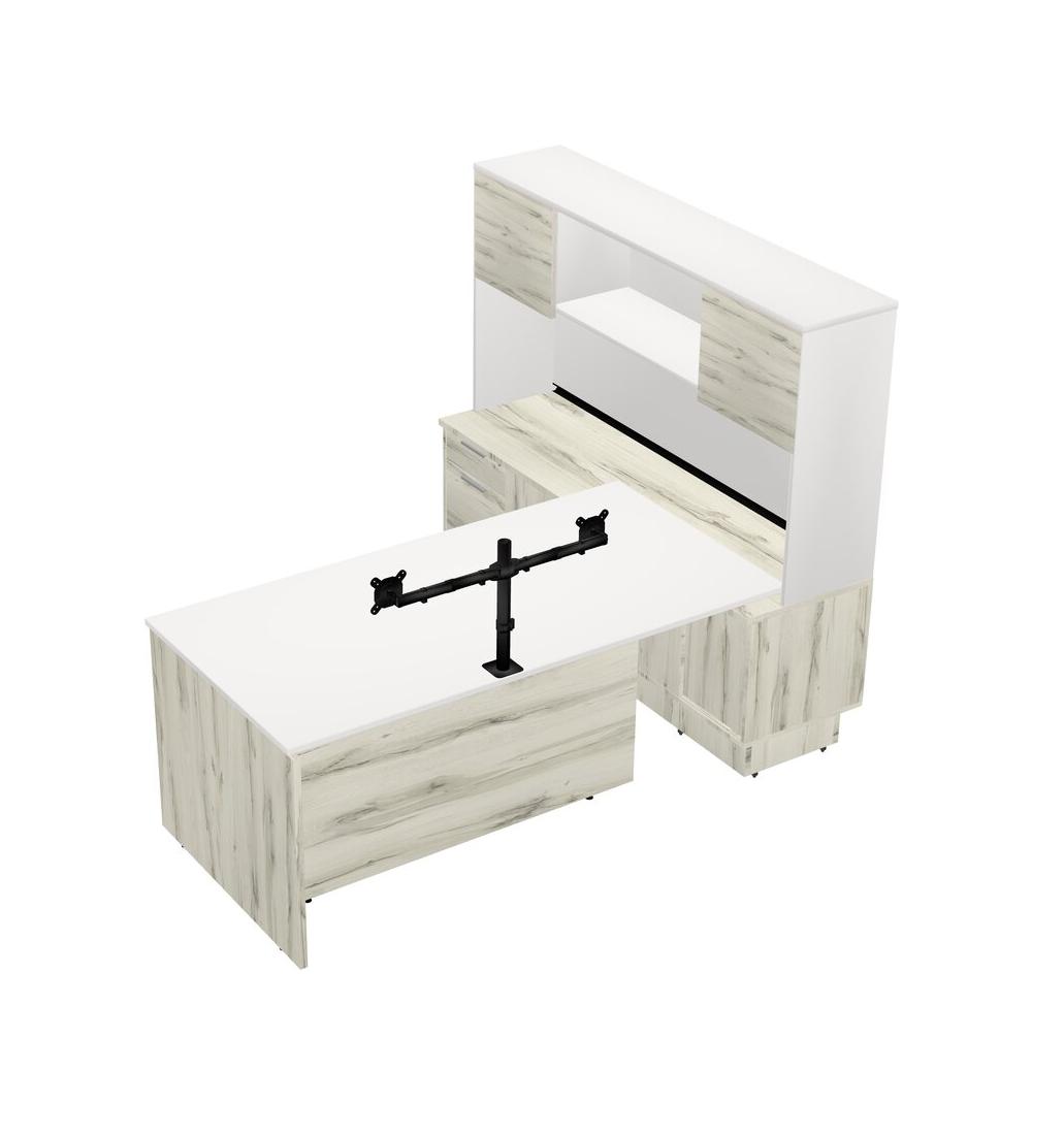 White Modern Executive Desk With Low Sliding Door Cabinet With Built-in Drawers + Monitor Arm (double Arms) + Hutch
