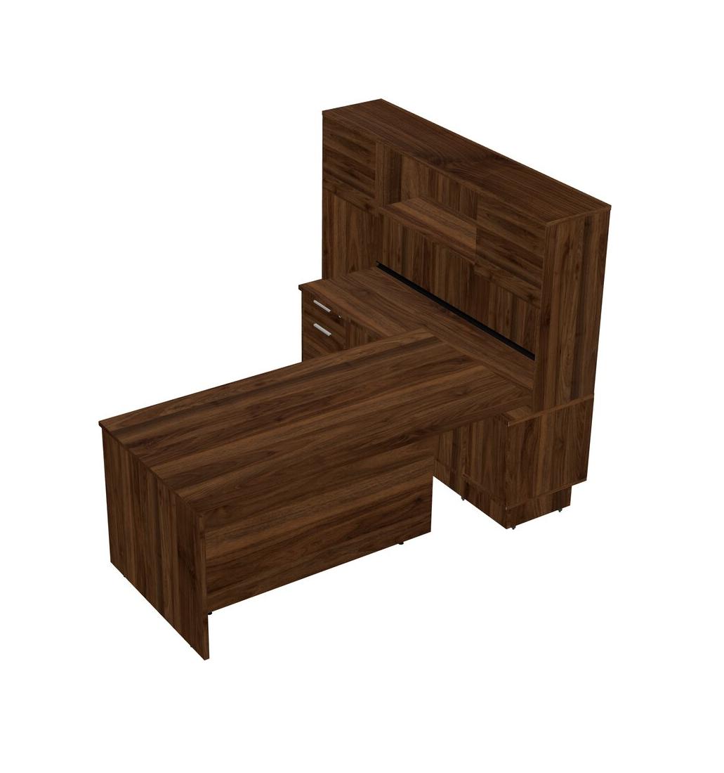 Columbia Walnut Modern Executive Desk With Low Sliding Door Cabinet With Built-in Drawers + Hutch