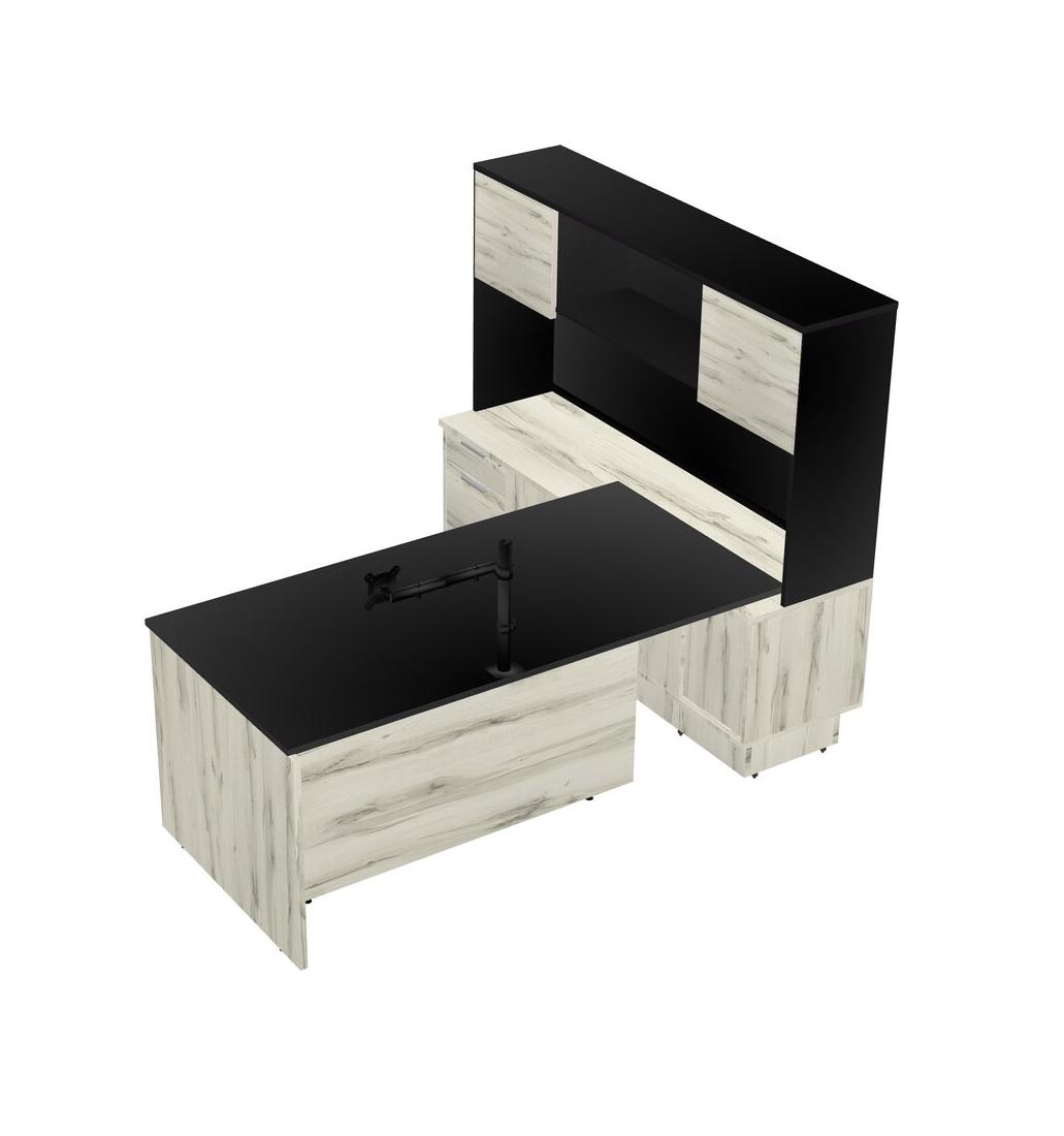 Black Modern Executive Desk With Low Sliding Door Cabinet With Built-in Drawers + Monitor Arm (single Arm) + Hutch