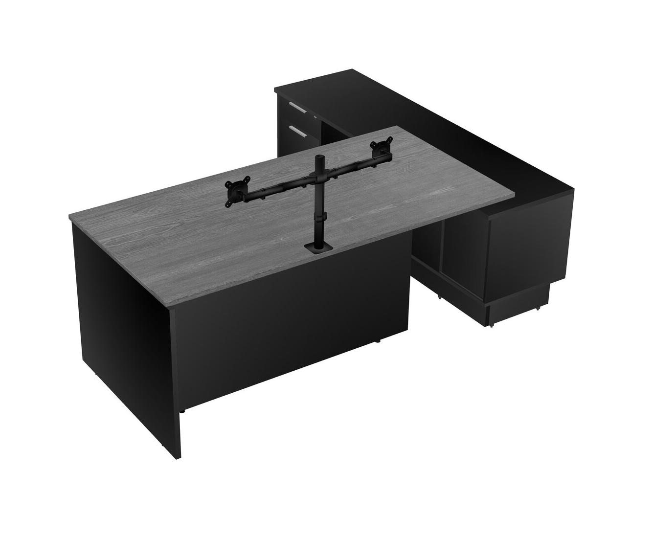 Grey Modern Executive Desk With Low Sliding Door Cabinet With Built-in Drawers + Monitor Arm (double Arms)