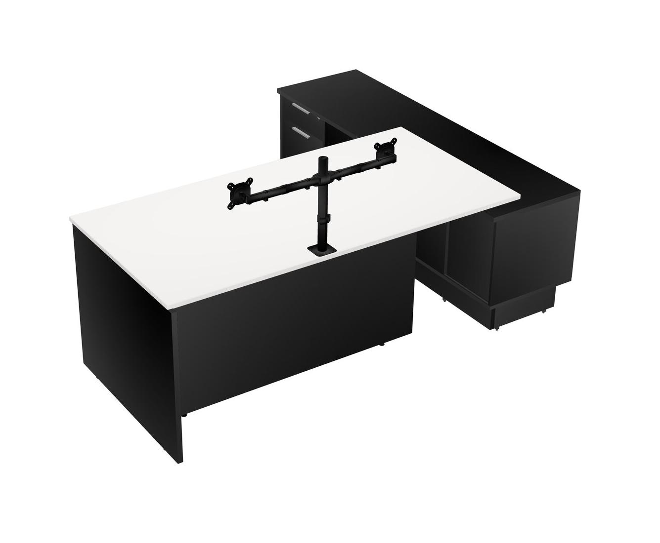 White Modern Executive Desk With Low Sliding Door Cabinet With Built-in Drawers + Monitor Arm (double Arms)