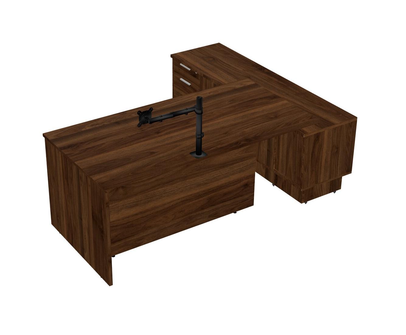 Columbia Walnut Modern Executive Desk With Low Sliding Door Cabinet With Built-in Drawers + Monitor Arm (single Arm)