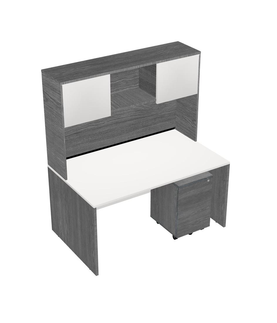 White Rectangular Office Desk Plus Grey Wooden Mobile Drawers And Grey Hutch
