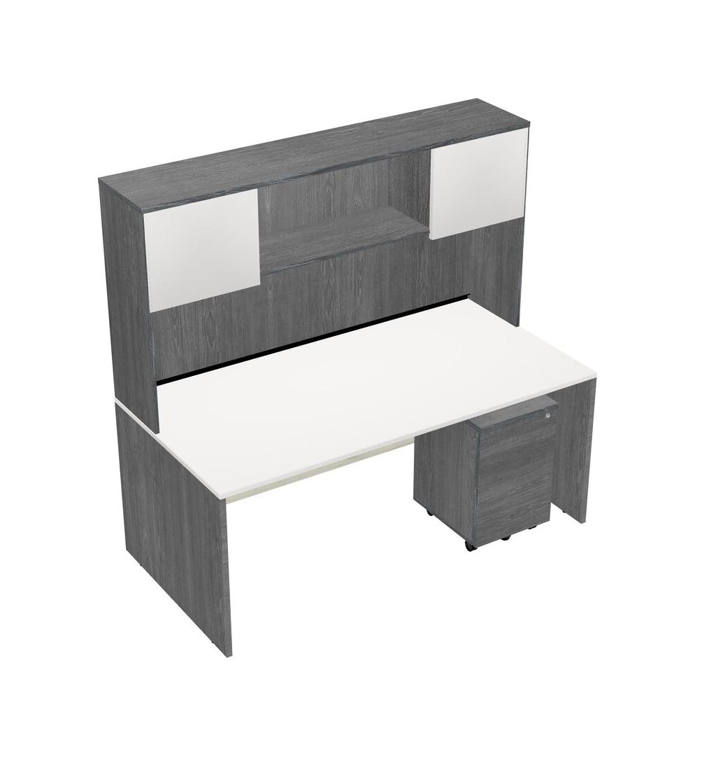 White Rectangular Office Desk Plus Grey Wooden Mobile Drawers And Grey Hutch