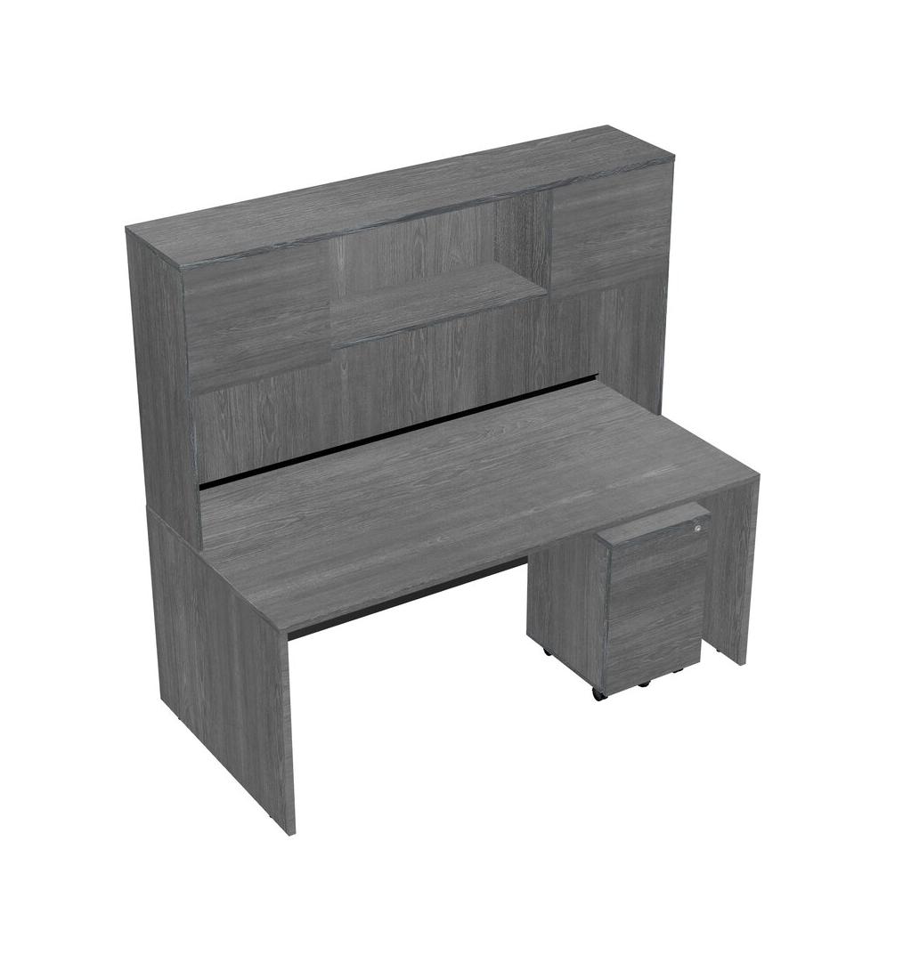 Grey Rectangular Office Desk Plus Grey Wooden Mobile Drawers And Grey Hutch