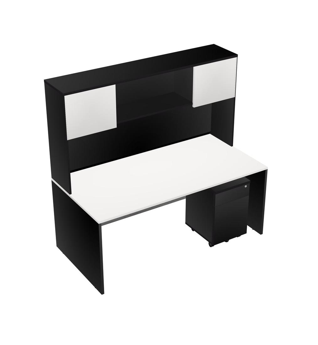 White Rectangular Office Desk Plus Black Wooden Mobile Drawers And Black Hutch