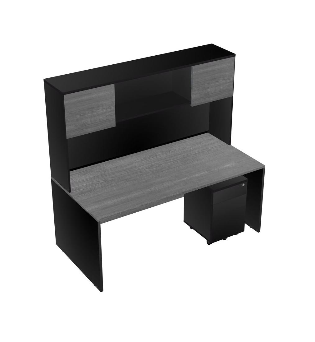 Grey Rectangular Office Desk Plus Black Wooden Mobile Drawers And Black Hutch