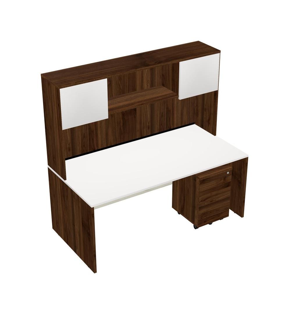 White Rectangular Office Desk Plus Columbia Walnut Wooden Mobile Drawers And Columbia Walnut Hutch