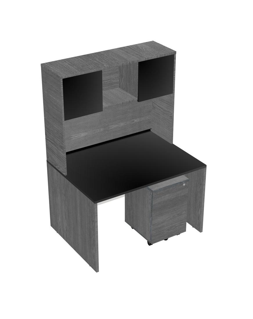 Black Rectangular Office Desk Plus Grey Wooden Mobile Drawers And Grey Hutch